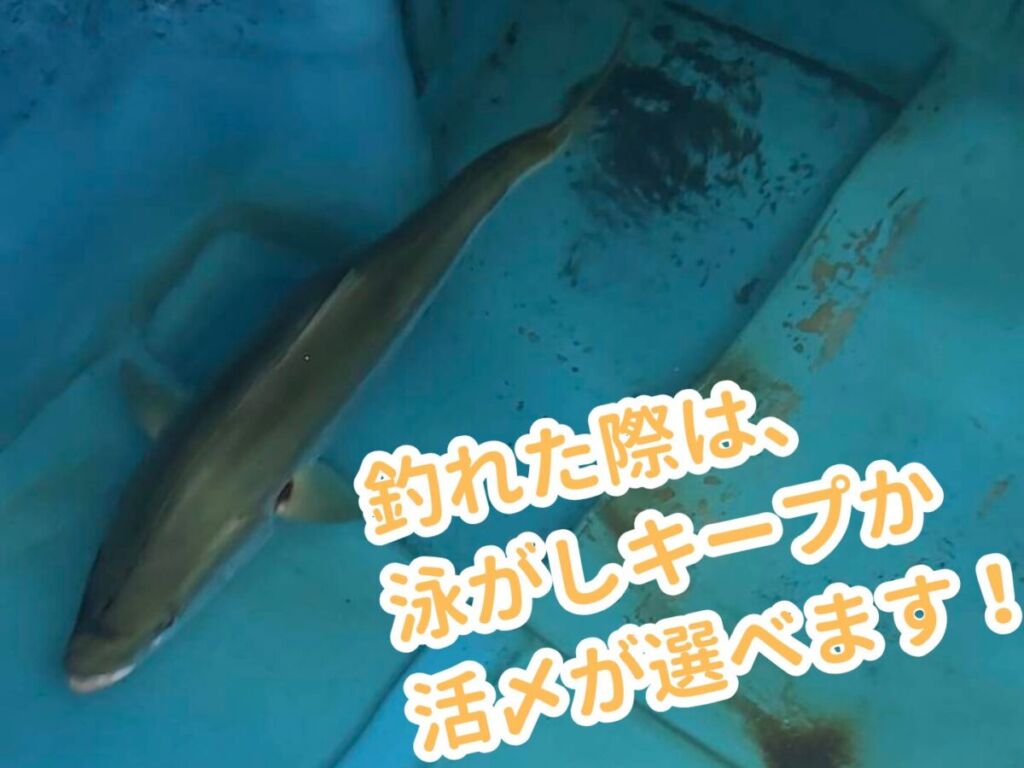 その間、船から釣り糸をたらして天然魚を釣るというプランとなります。